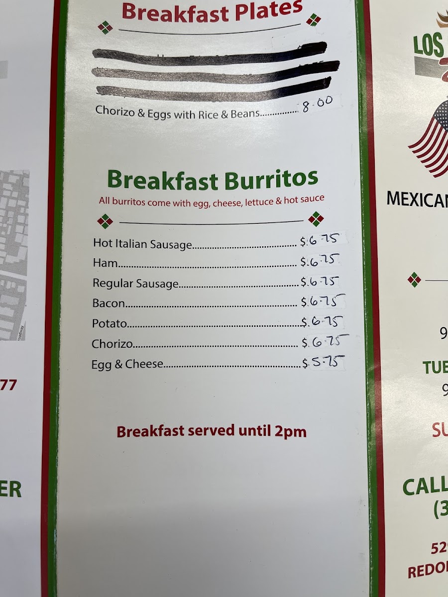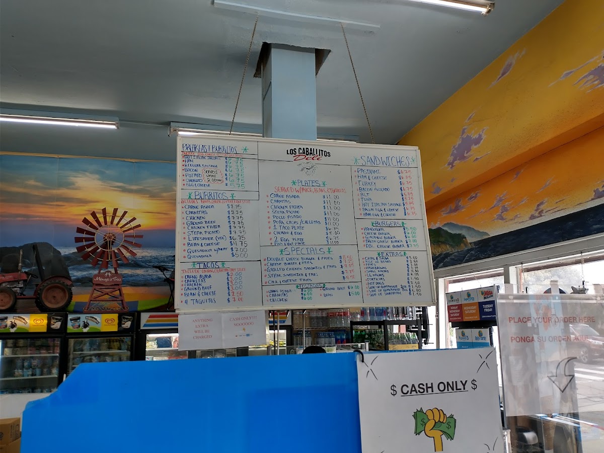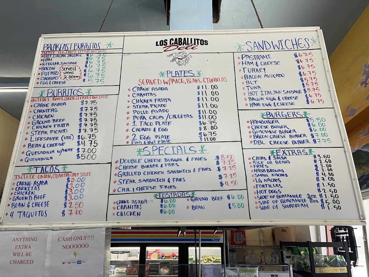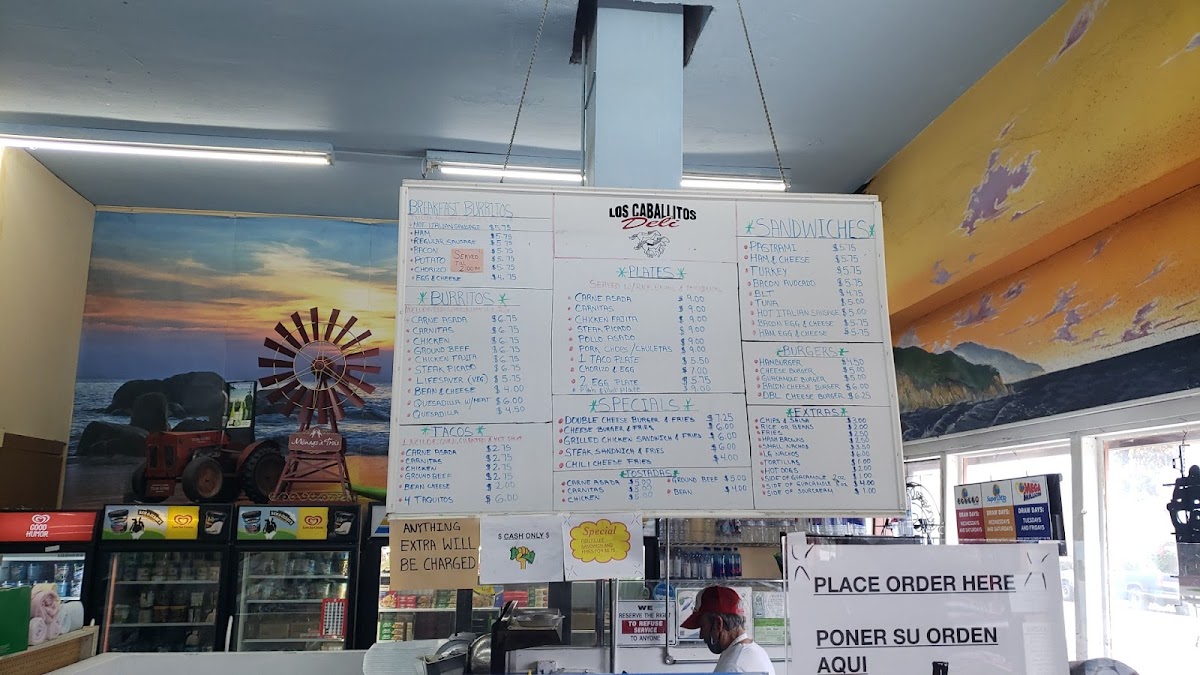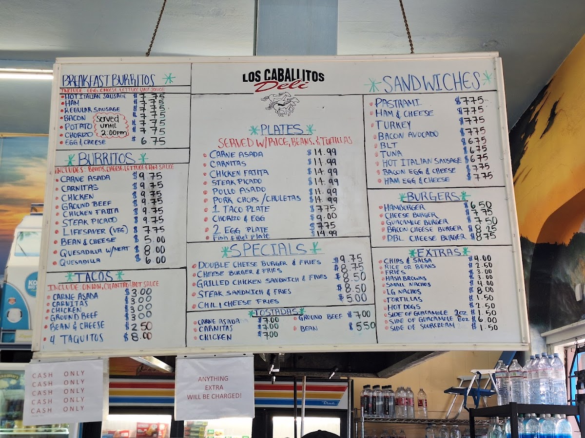 From a reviewer’s perspective, the menu at Los Caballitos - Mexican And American Food offers a simple but satisfying selection that focuses on classic, hearty favorites at reasonable prices. The sandwich section includes familiar choices like Ham & Cheese, Turkey, Bacon Avocado BLT, and Tuna, making it easy to find a quick and filling option. For breakfast, the Chorizo & Eggs With Rice & Beans plate stands out as a flavorful and traditional choice, while the breakfast burrito lineup-Hot Italian Sausage, Regular Sausage, Bacon Potato, and Chorizo-provides a variety of savory, well-portioned options that are great for a morning meal on the go. The menu also features popular Mexican staples such as Carne Asada, Carnitas, Ground Beef, Chicken Fajita, and the Lifesaver, giving customers a range of hearty, protein-rich dishes to choose from. Overall, the menu is straightforward, affordable, and focused on satisfying comfort food, making it a reliable spot for both Mexican and American favorites.